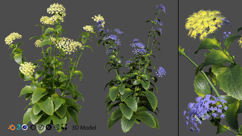 This 3D model pack features two delicate wildflowers, commonly found in meadows and grasslands. While the exact species are difficult to discern, their resemblance to Zizia aptera and Meadow Parsnip violet makes them perfect for adding a touch of botanical realism to your scenes.