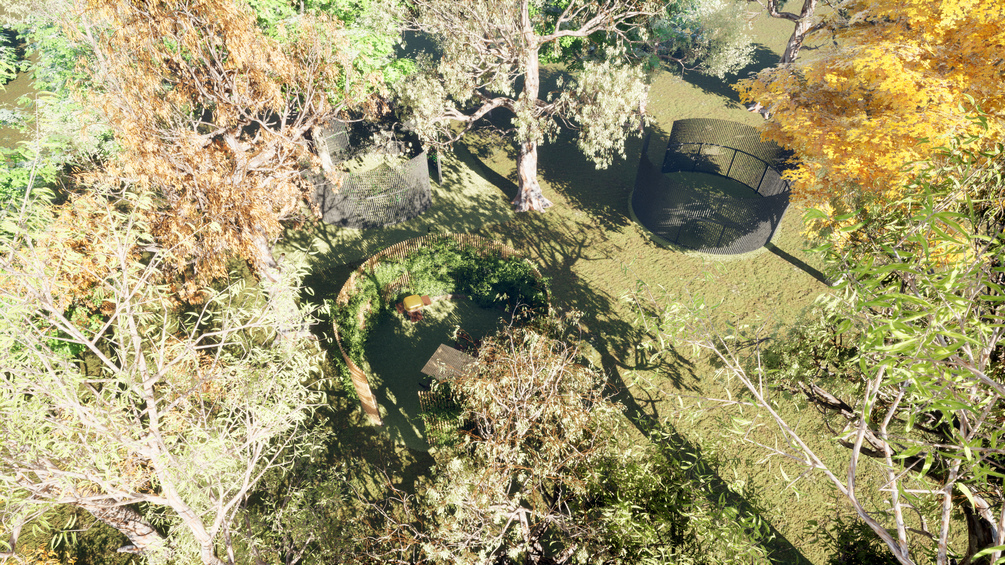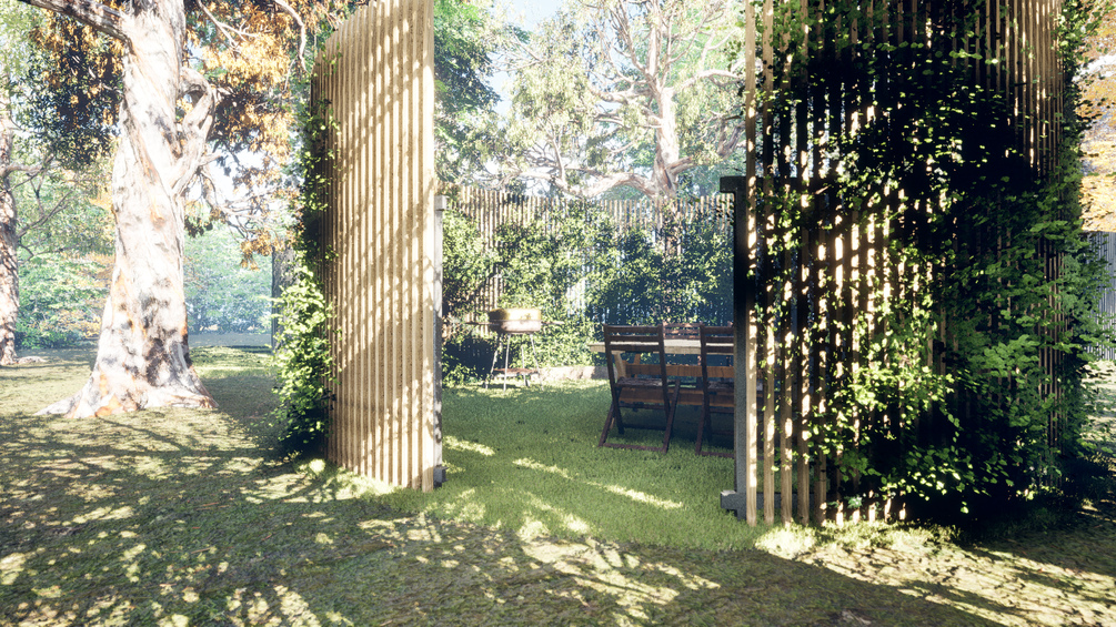 The surrounding landscape is filled with trees, including gum trees and gray poplar trees. These trees provide shade and privacy for the pergola, making it a secluded retreat. The overall impression is one of peace and tranquility, making this 3D model ideal for those who appreciate spending time outdoors in a natural setting.