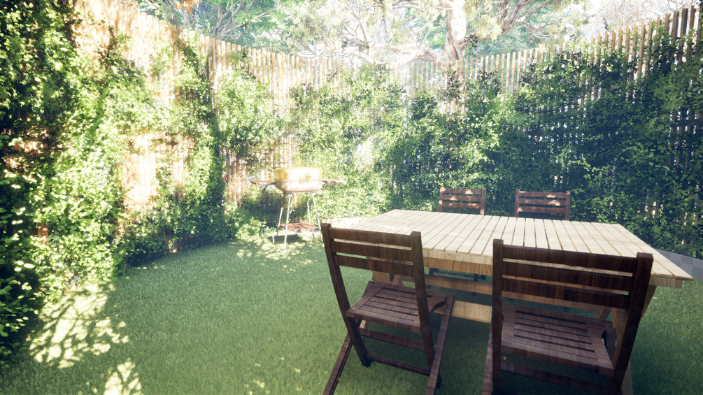 Within the pergola is a variety of outdoor furniture, including barbeque, chairs, a table, and a lounge chair. This suggests that the pergola is intended to be a place for relaxation and socializing.