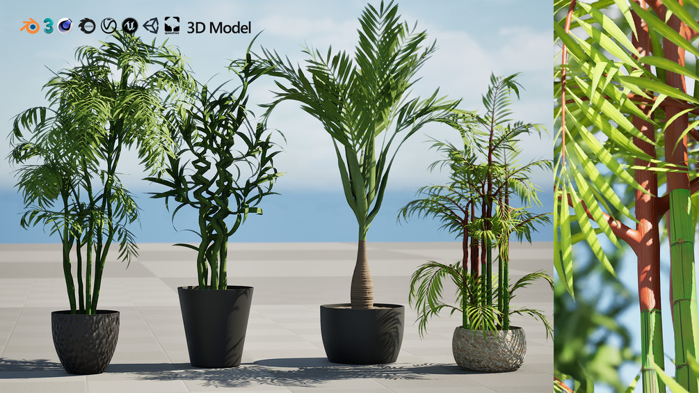 This high-quality 3D model collection features four meticulously crafted indoor palms, perfect for adding a touch of nature to your virtual scenes. Each palm is meticulously detailed, with realistic textures and lifelike foliage, ensuring they blend seamlessly into any 3D environment.