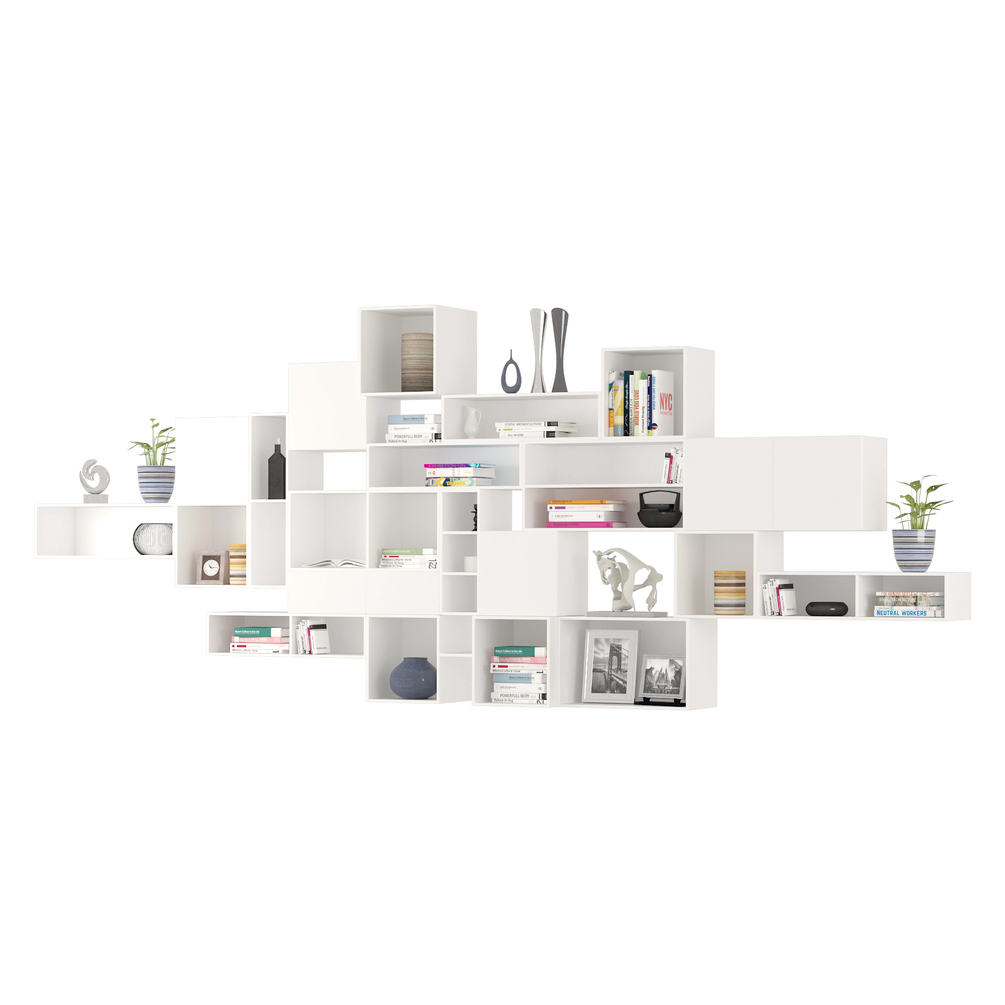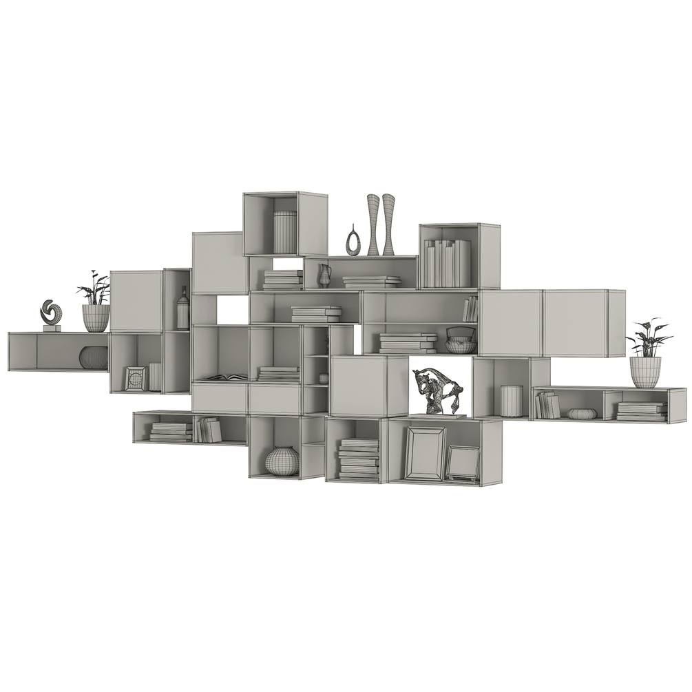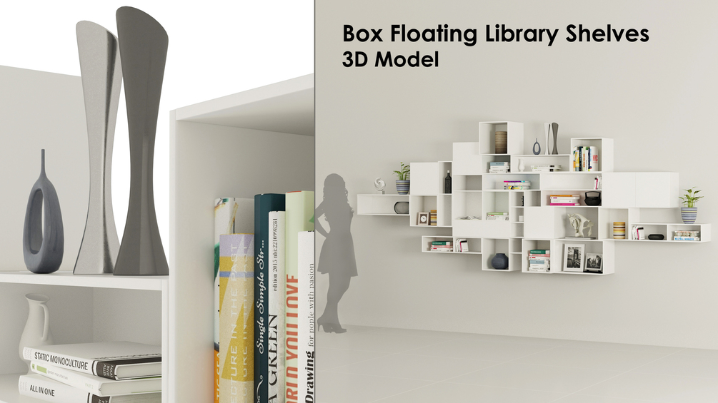 3d of a stuffy library with minimalist and modern box floating shelves.