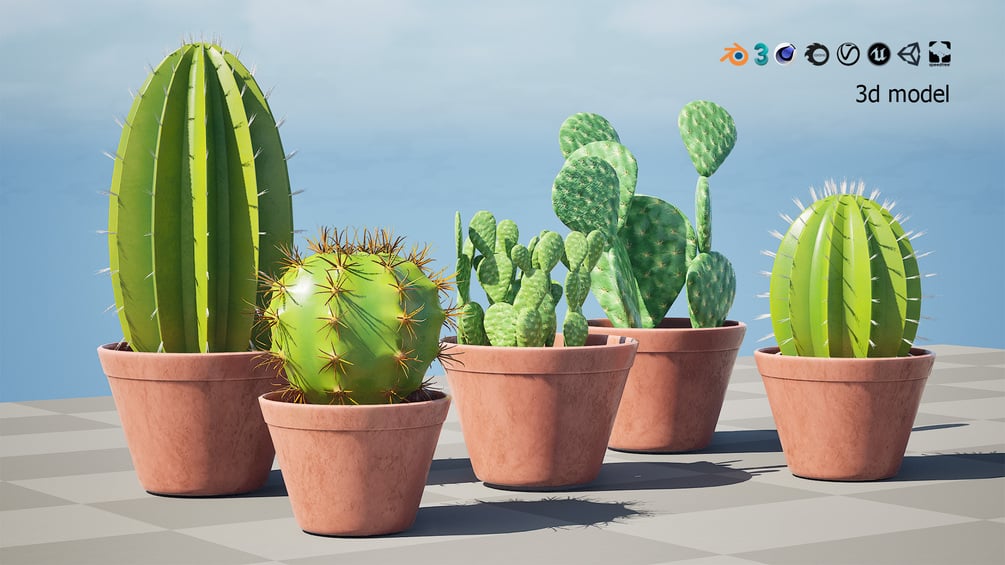 This pack includes a variety of cacti in different shapes, sizes, and textures, all meticulously modeled and textured to bring a touch of the desert to your projects. Each cactus is placed in a unique pot, adding a pop of color and variety to your scene.