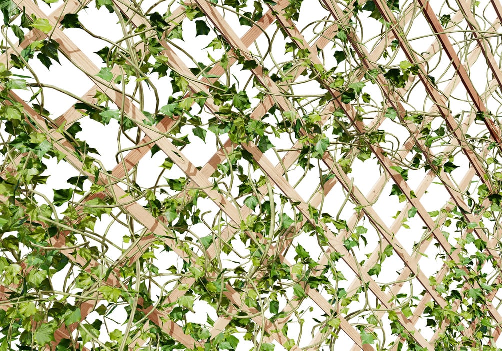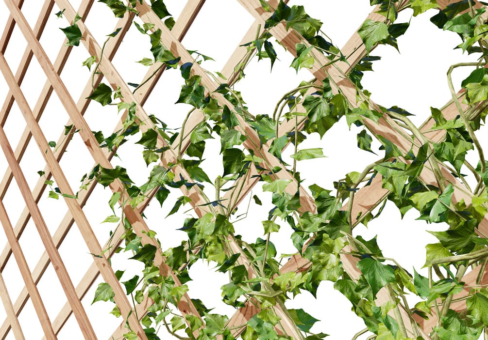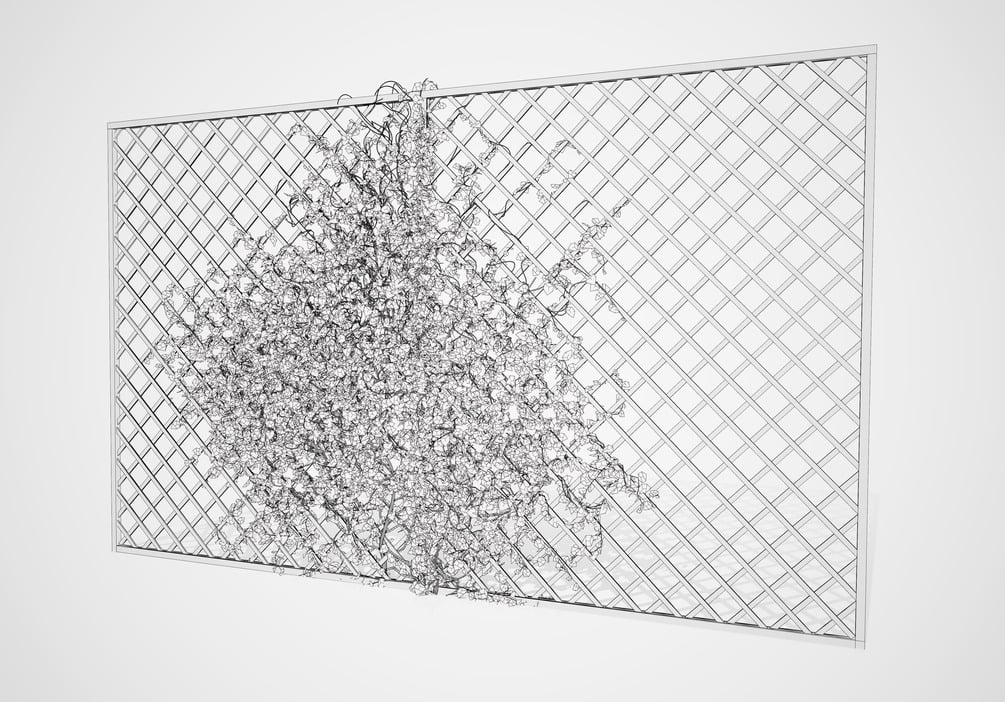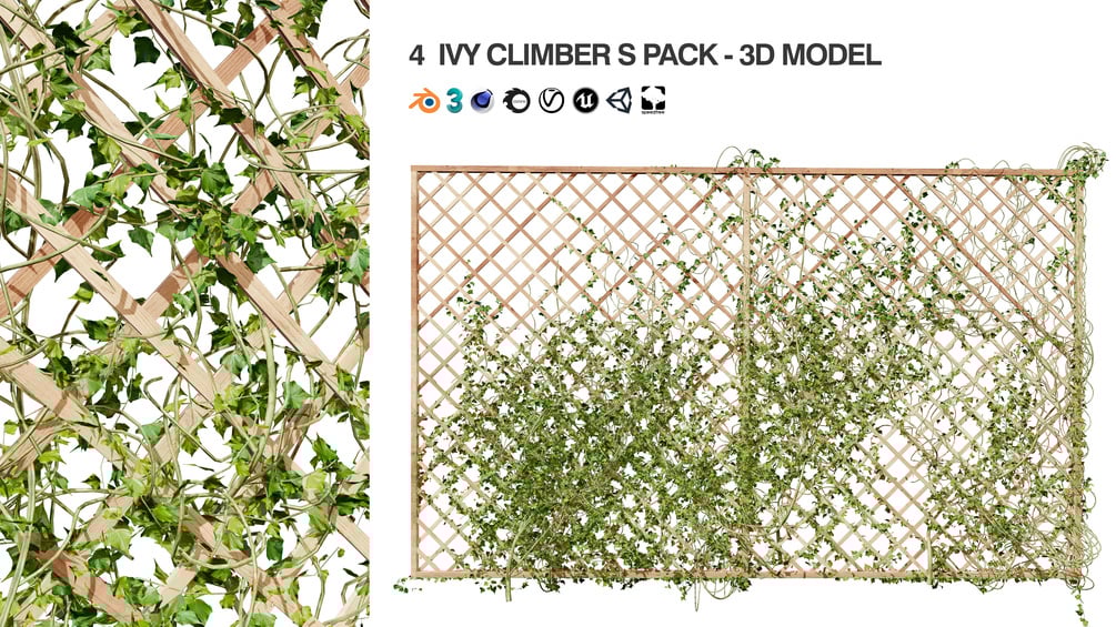 highly detailed 3d collection of wood mesh with ivy climber, this 3D model features a lush green ivy climber plant that has been carefully grown and trained to grow up a wall-mounted wood mesh. The ivy leaves are detailed and lifelike, and the overall effect is very realistic. This model is perfect for adding a touch of nature to any scene.
