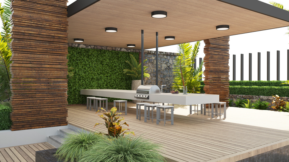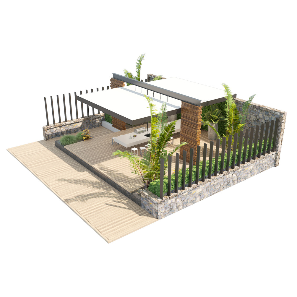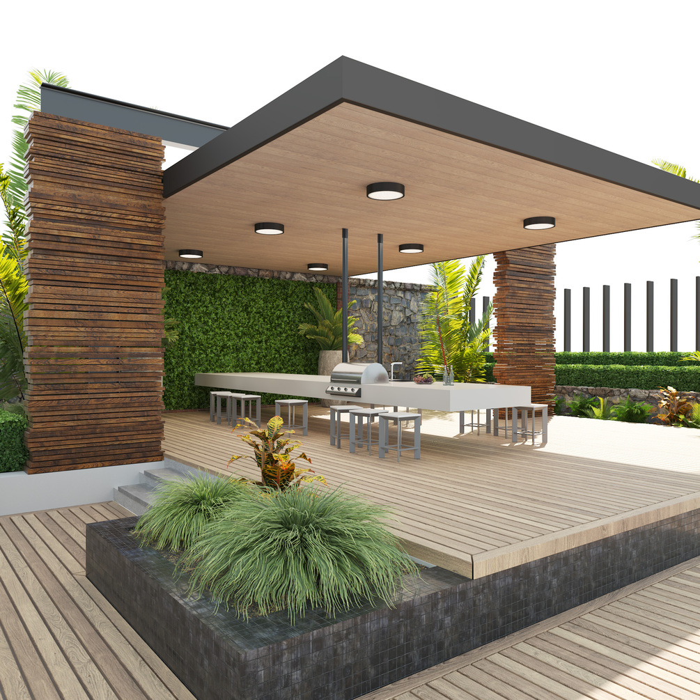 Highly detailed 3d model of modern house terrace with greenery plants,