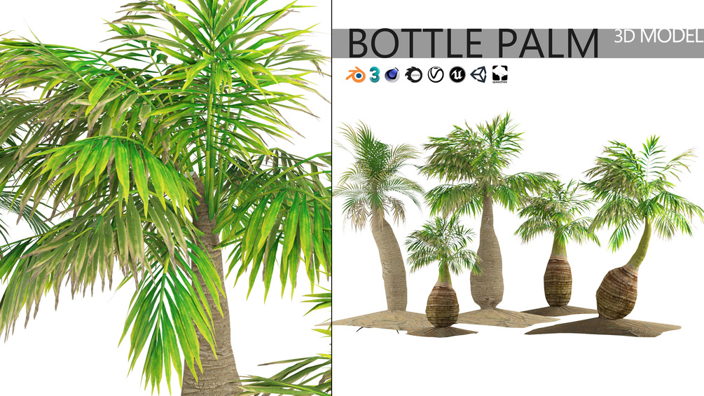 This is a set of 5 realistic, low poly, and game ready bottle palm trees. The trees are modeled in detail, with high-quality textures and materials. They are perfect for use in games, architectural visualizations, and other 3D projects.