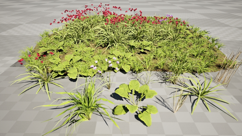 This asset includes a diverse collection of grass types, from short, fine varieties to taller, textured blades with seed heads, creating a natural ground cover. Adding vibrant life are scattered flowering plants, including striking clusters of small red flowers and individual purple blossoms, providing realistic pops of color. Perfect for visualizations, games, animations, and any project requiring a touch of authentic wilderness.