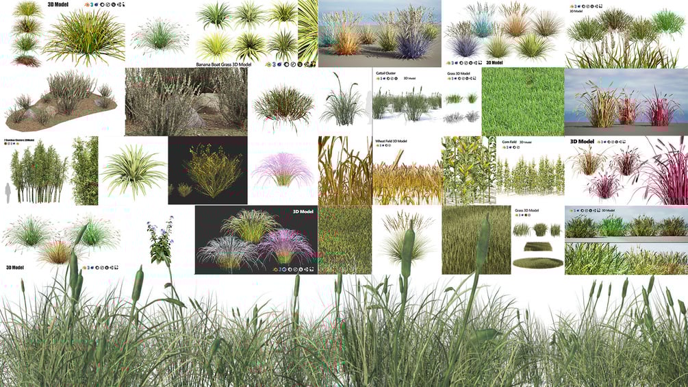 This diverse pack includes a wide range of grass types, from delicate wildflowers to tall, swaying reeds, ensuring you'll find the ideal asset for any scene. These models are meticulously crafted with a focus on detail and performance, making them suitable for both large-scale outdoor environments and intimate close-ups.