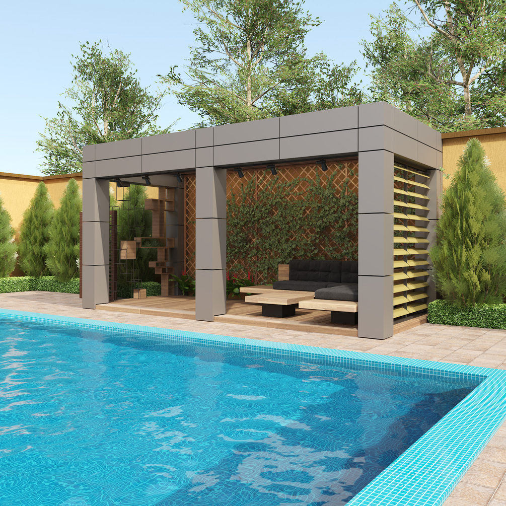 This beautifully 3D model of a pergola on a pool with conifer trees is the perfect addition to any scene. The pergola provides shade and shelter from the sun, while the conifer trees add a touch of greenery and natural beauty. The model is highly detailed and realistic, making it perfect for close-up shots or use in large scenes.