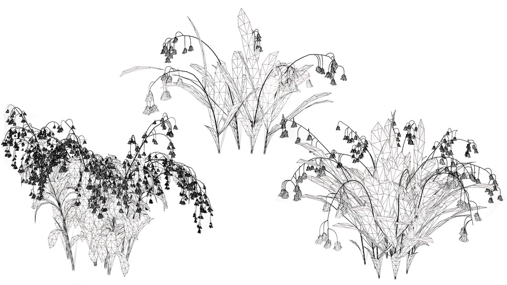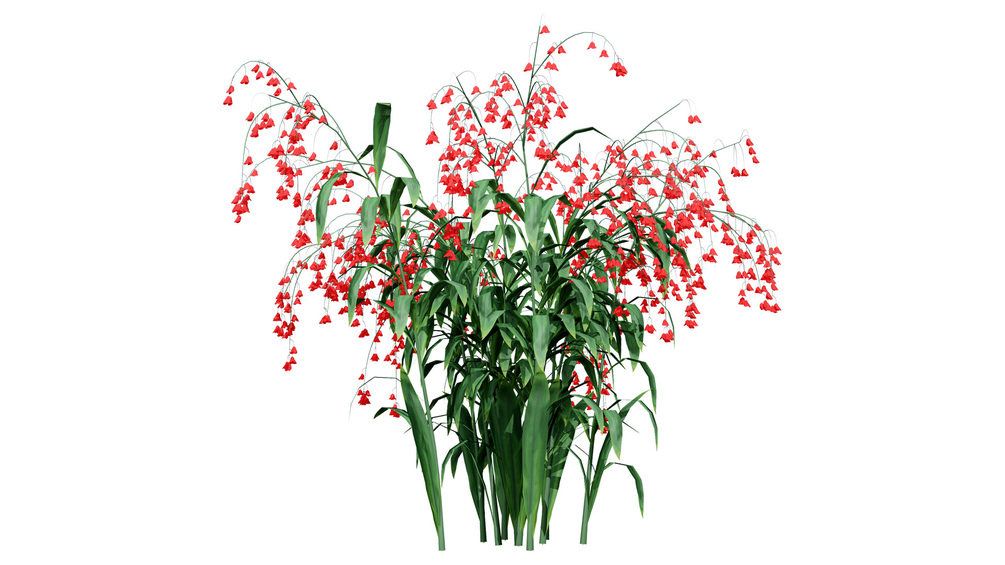 The plants in your image appear to be 3D models of Convallaria majalis (Lily of the Valley) and a taller plant with red flowers that is not Lily of the Valley, but a separate species added for variety. The Lily of the Valley models show two variants: one with classic white flowers and another with pink flowers (Convallaria majalis 'Rosea' or similar).