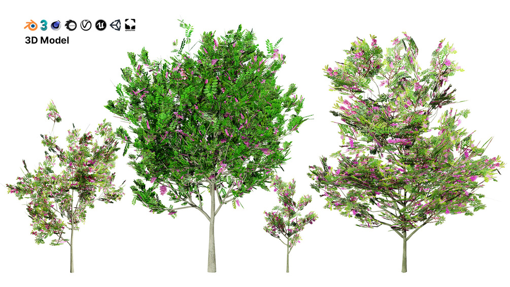 This high-quality 3D model features a Purple Robe Robinia tree in four growth stages, ranging from a young sapling to a mature tree. The model is highly detailed, with accurate textures and materials that capture the unique appearance of this beautiful tree. It's ideal for creating realistic and immersive environments in architectural visualizations, landscape design, and game development.