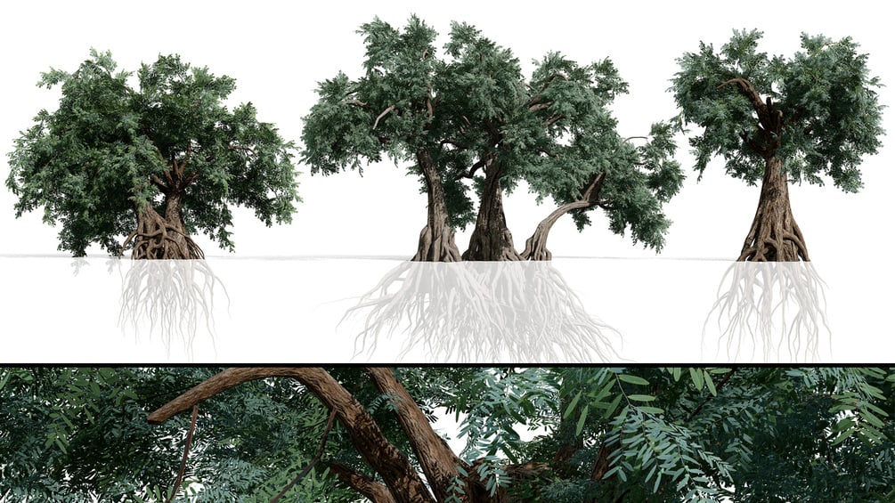 Each tree is crafted with a focus on photorealism, balancing high-detail geometry with optimized topology. The exposed root systems and weathered bark textures provide an authentic "ancient" feel, making them ideal hero assets for desert oases, Mediterranean courtyards, or historical Middle Eastern settings.