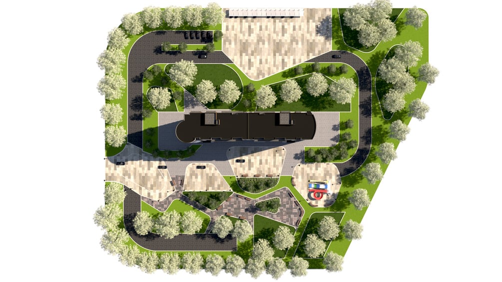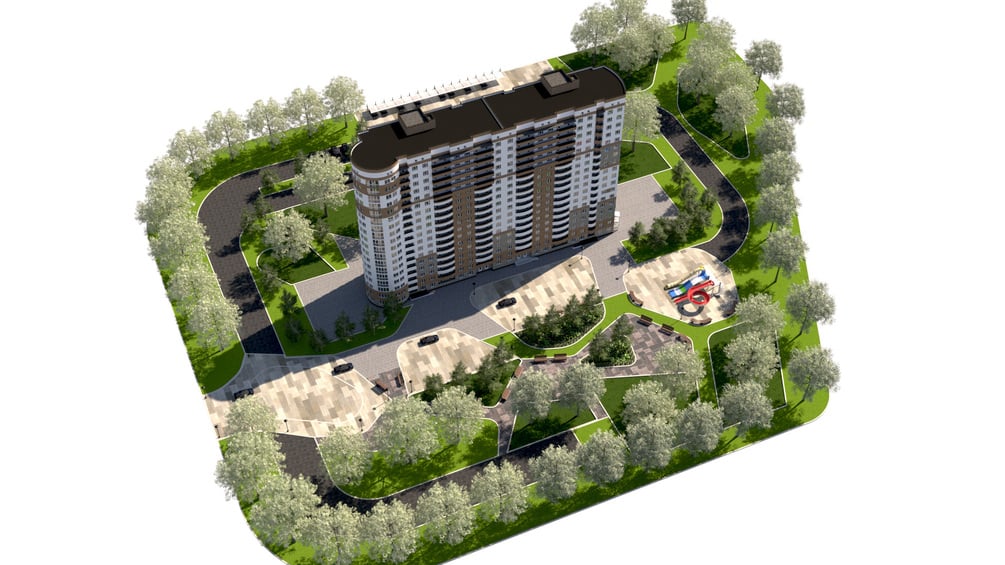 Complete Scene Included: Purchase includes the multi-story residential building and a fully rendered site plan featuring: