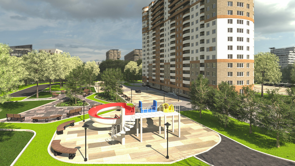 Recreational zone with a visible playground structure.