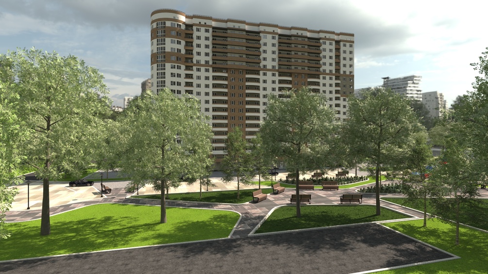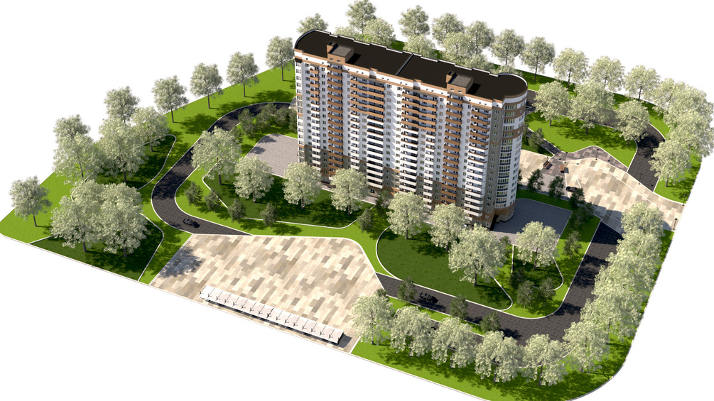 This complete scene includes the apartment building, surrounding landscape, parking, and common areas, making it a perfect, ready-to-render asset for professional presentation.