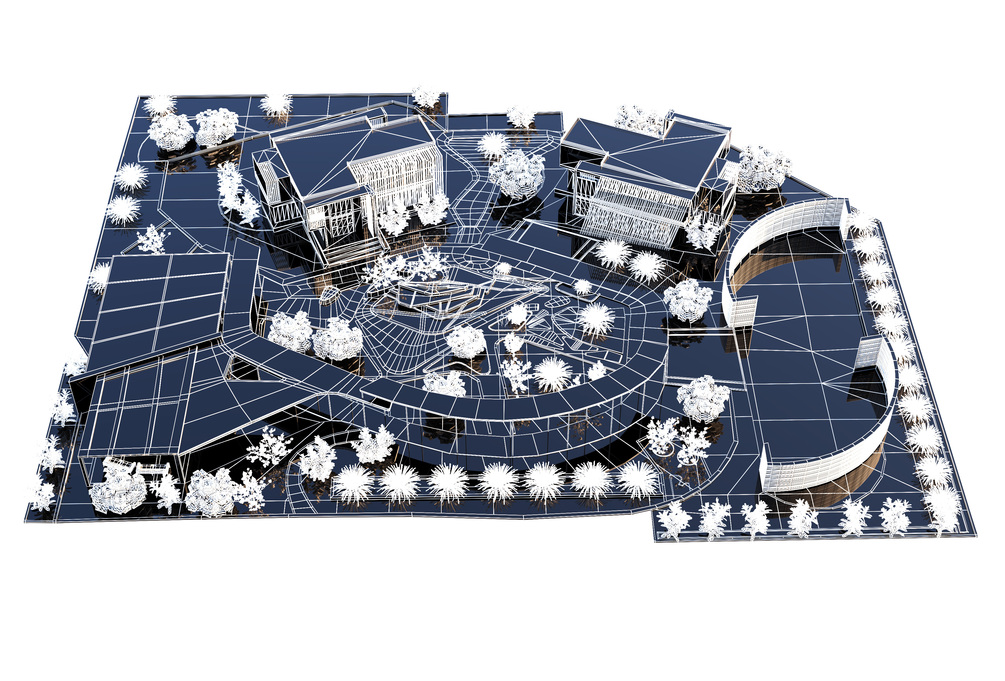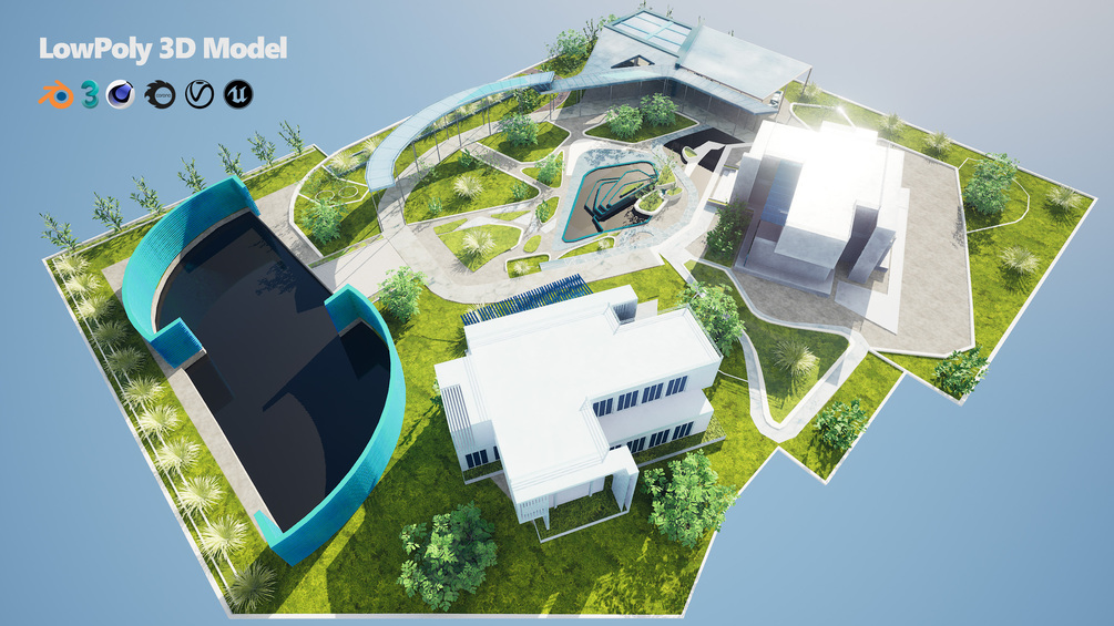 * This meticulously crafted 3D model showcases a contemporary urban park, seamlessly blending architectural elegance with natural beauty.