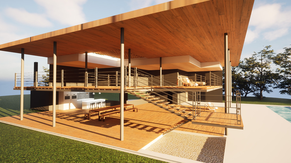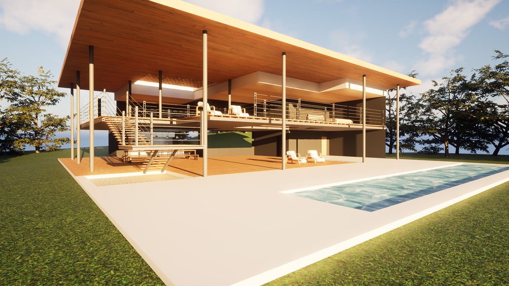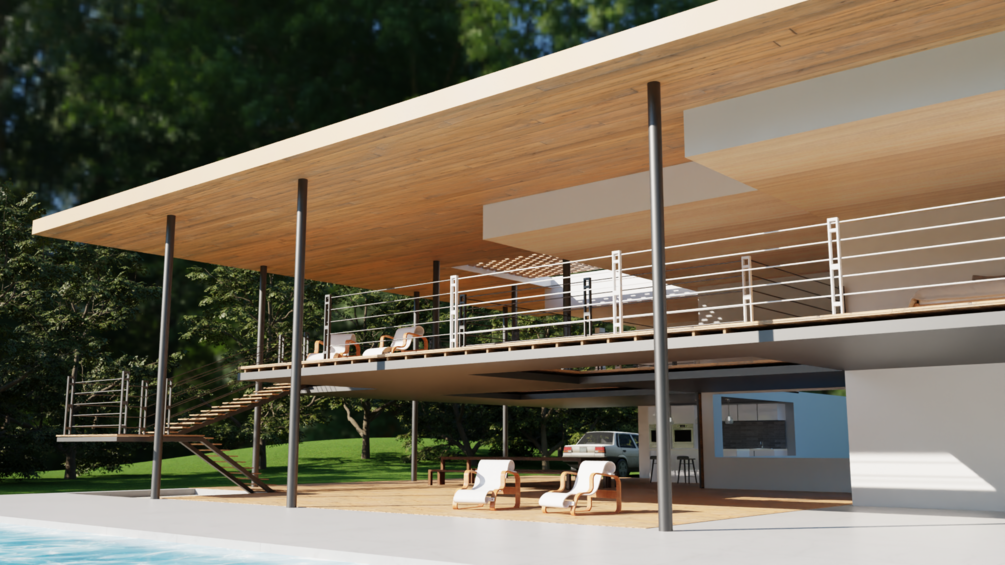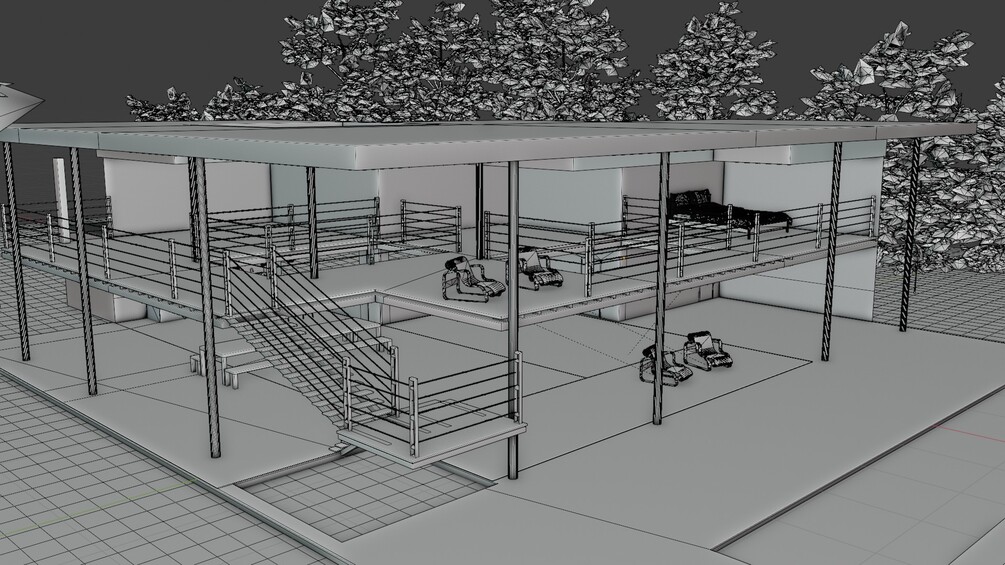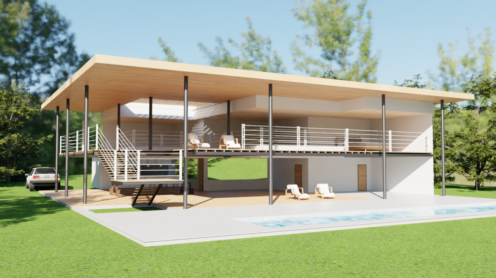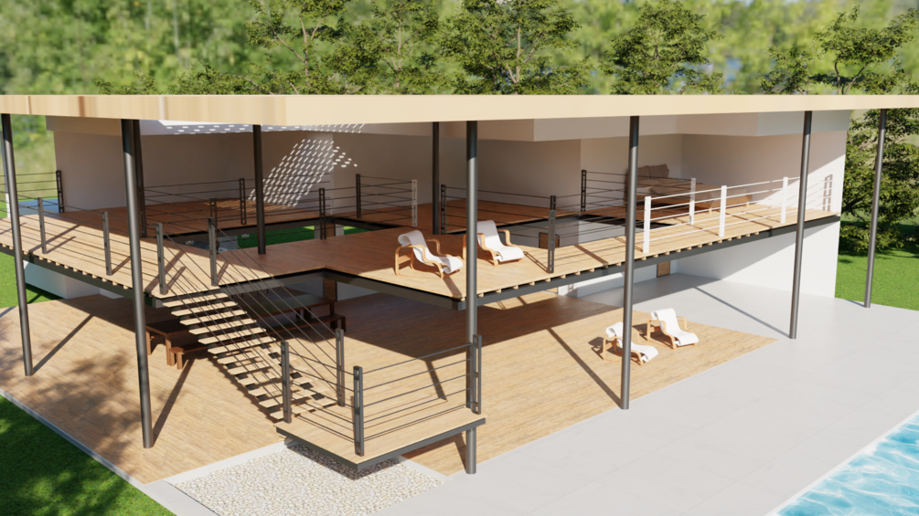 Get this low poly 3D exterior scene of a stylish open house integrated into a serene forest landscape. Perfect for visualizations, presentations, and design exploration. Includes a contemporary house design and surrounding natural environment with a pool.
