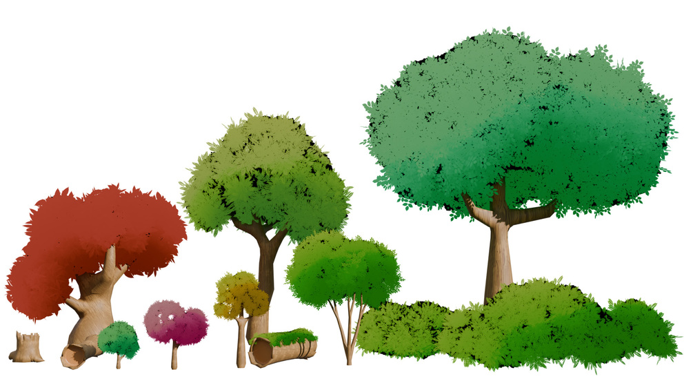* Diverse Tree Variety: Explore a range of stylized tree models, including deciduous and coniferous options, each with unique shapes and textures.