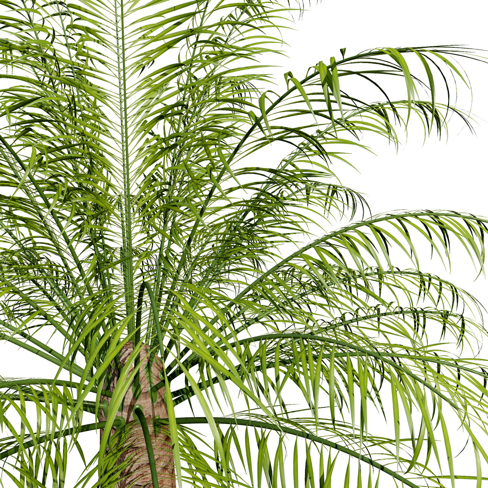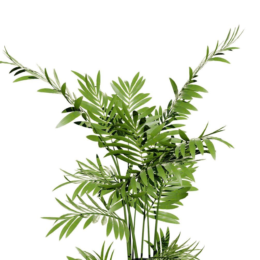 The collection includes three different species of palm trees: a Kentia palm, an Areca palm, and a fishtail palm.