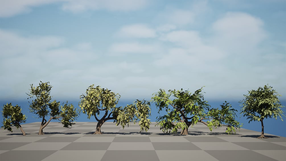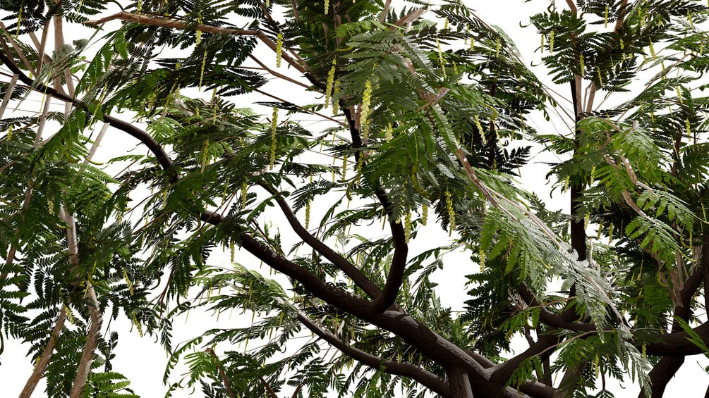 This asset pack features four distinct growth variations, ranging from a solitary upright tree to complex, multi-stemmed, and windswept forms typical of desert landscapes. The models showcase the tree's signature gnarled bark, intricate branch structure, and delicate, feathery foliage, making them perfect for close-up architectural visualizations or large-scale environmental scattering.