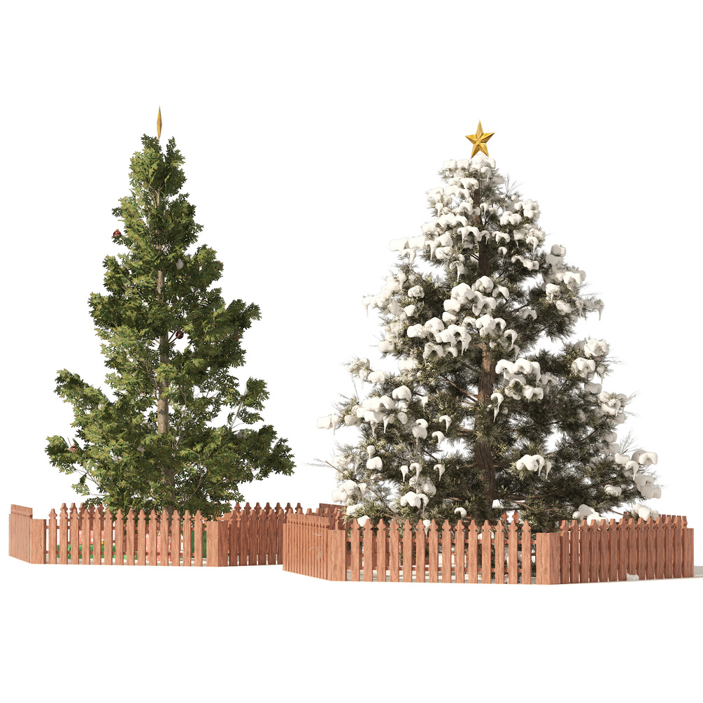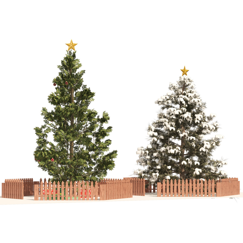 Highly detailed 3d model of 2 outdoor christmas trees snowy red cedar tree (high poly tree)and Scots Pine Needle tree (low poly tree), both trees have wood fence.
