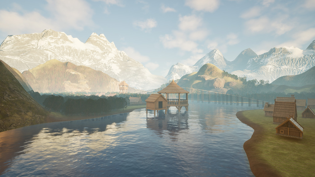 • Detailed Natural and Structural Assets: A key highlight is the long suspension bridge that stretches across the river, connecting different parts of the environment. A rustic wooden dock and a small, inviting riverside hut add to the scene's charm and functionality. Other details include large, mossy rocks and a stone-ringed campfire, perfect for creating dynamic and engaging scenes.