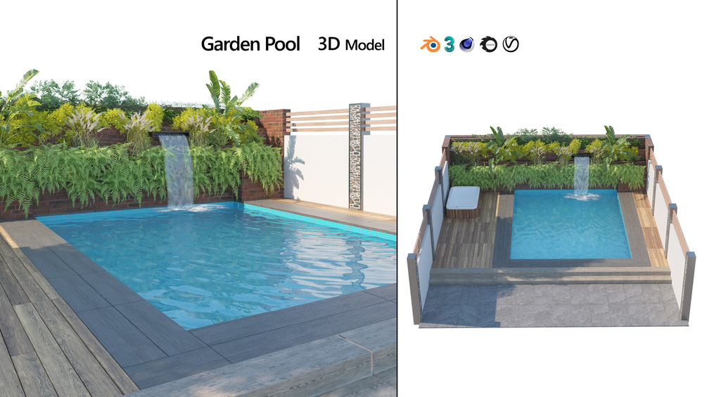 Highly detailed 3d model of modern garden pool with landscape and Greenwell,