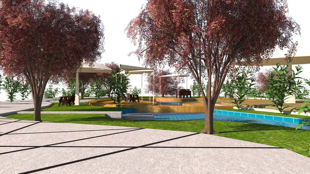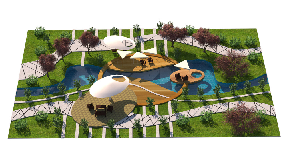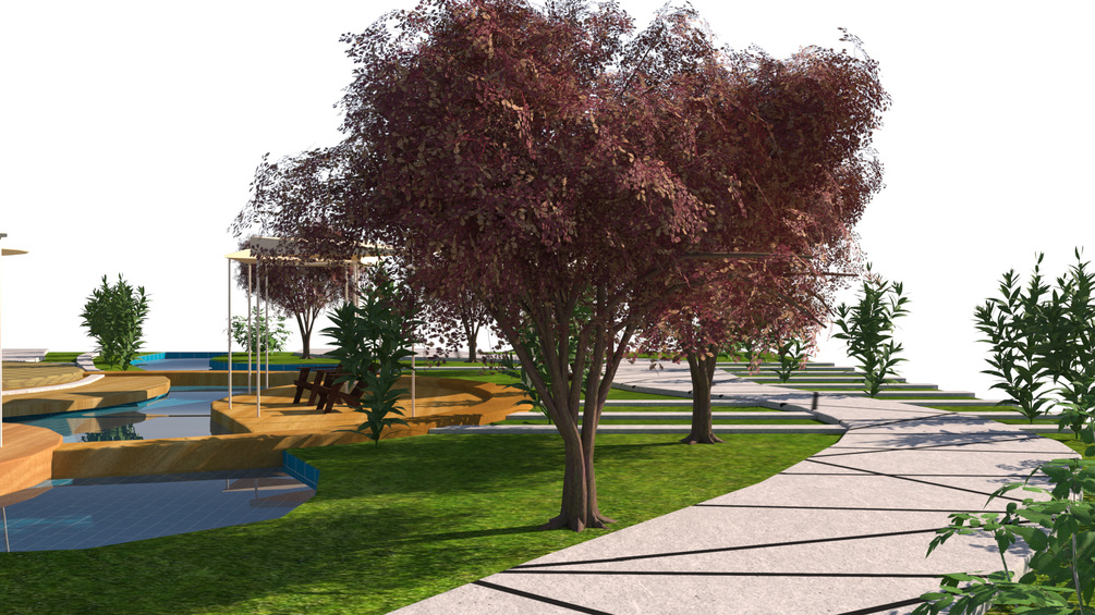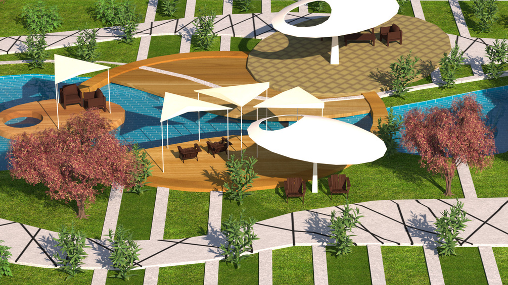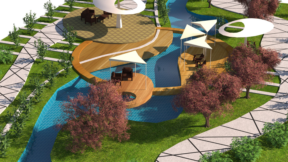 * Architectural Elegance: A modern pavilion with unique curved roofs provides a shaded gathering space, while stylish seating areas invite visitors to unwind.
