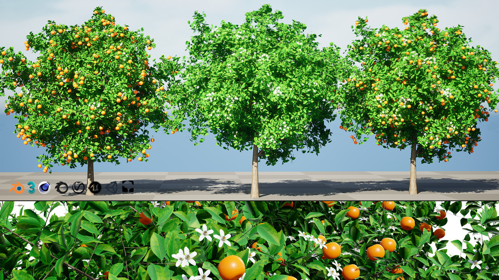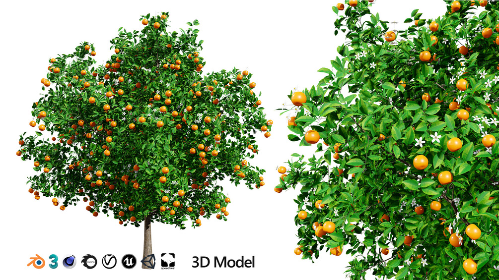 This 3D model collection features three detailed orange trees in various stages of growth. Perfect for adding a touch of nature to your virtual environments, these models are ideal for game development, architectural visualizations, or any 3D project that requires realistic citrus trees.