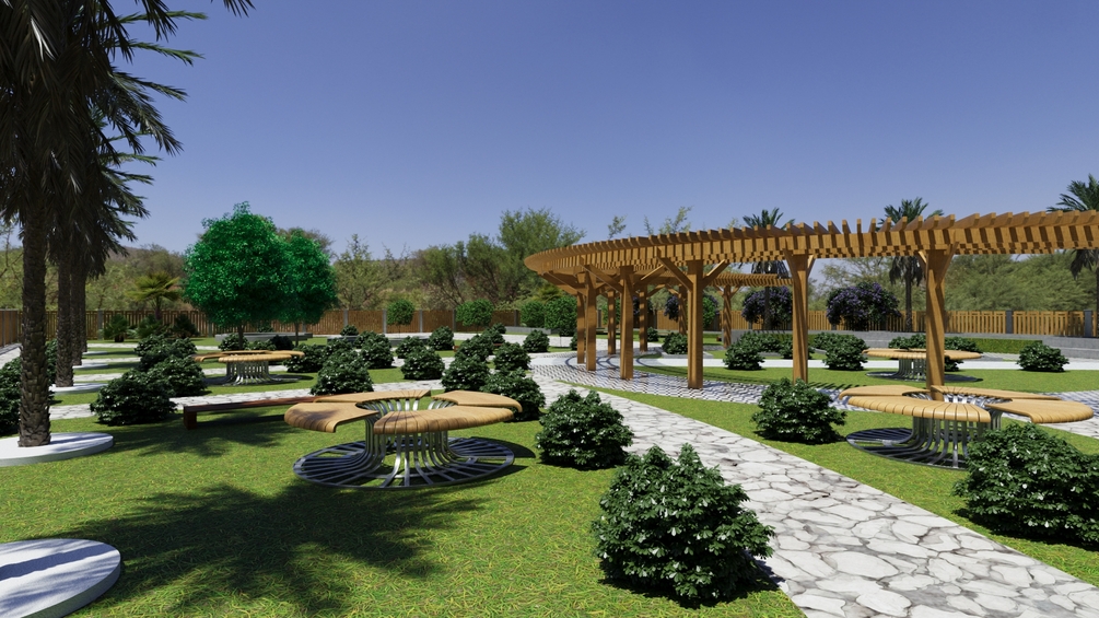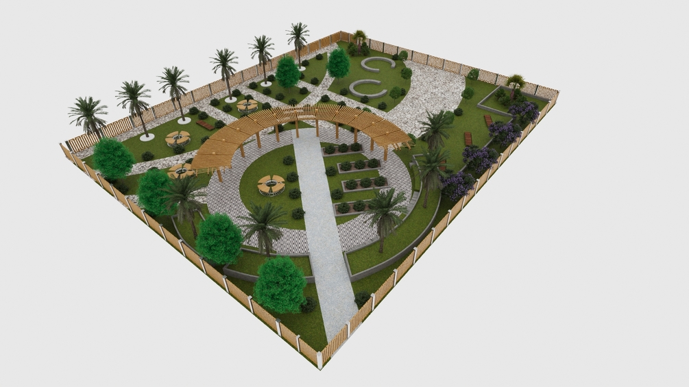 This stunning Landscape park 3D model contains the essence of a relaxing tropical retreat. Lush palm trees sway gently in the breeze, casting dappled shadows on a manicured lawn. A rustic wooden pergola provides a perfect spot to relax and enjoy the view.
