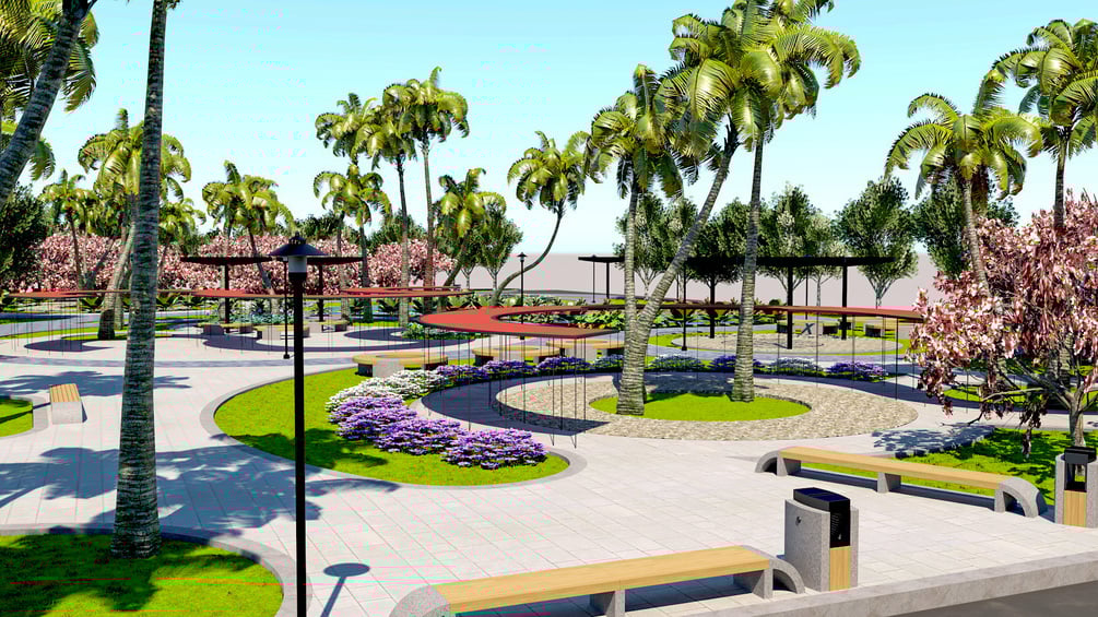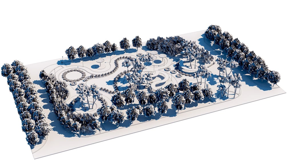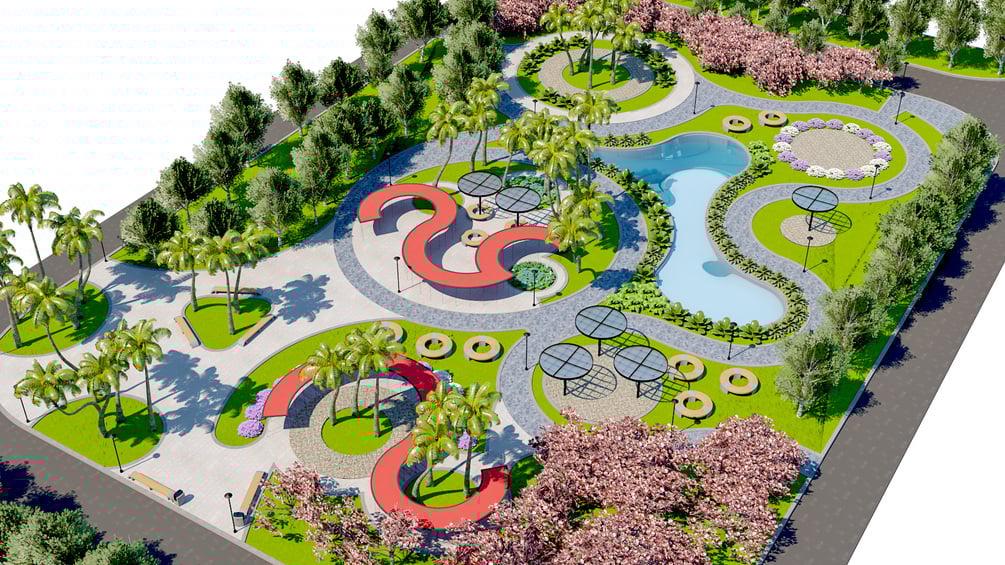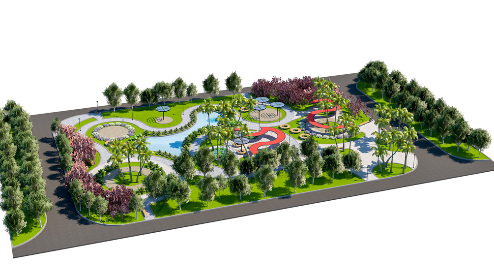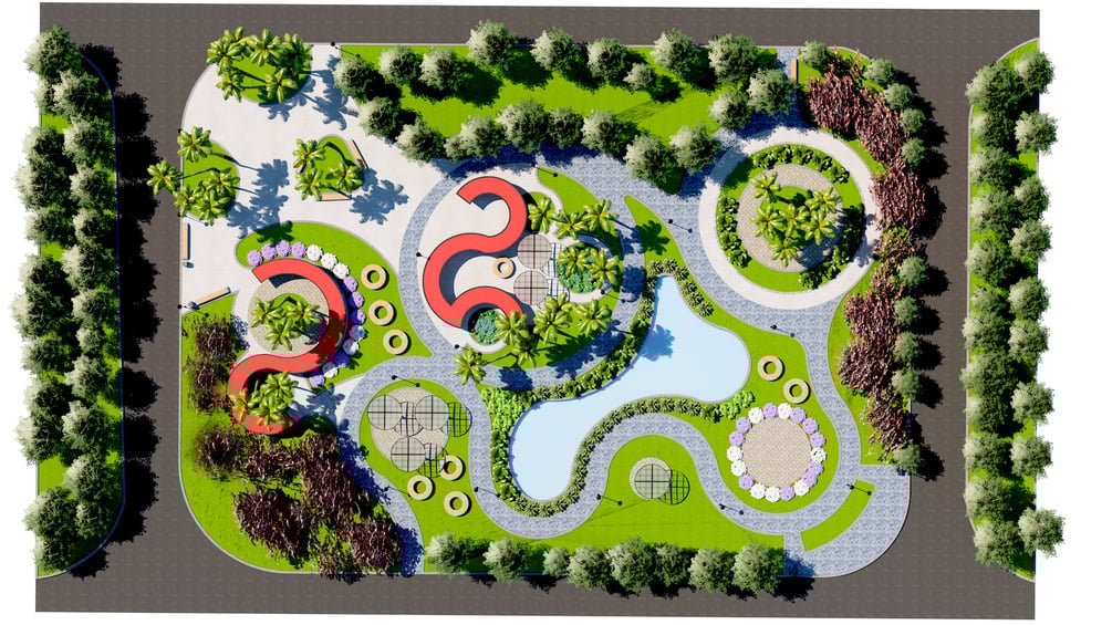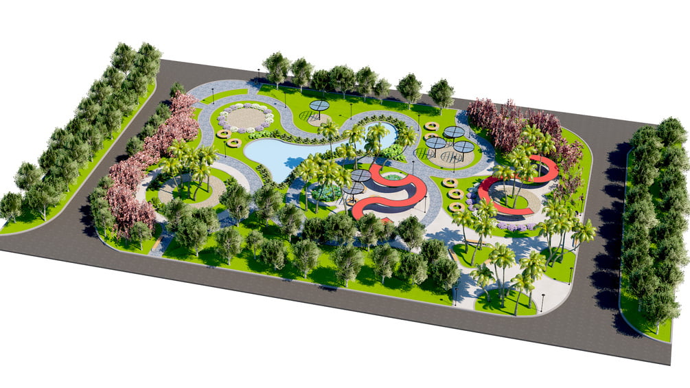 This 3D model presents a vibrant, high-detail urban park design, perfect for architectural visualization, game environments, or city planning projects. It features a modern, fluid layout characterized by organic curves and multi-functional zones.