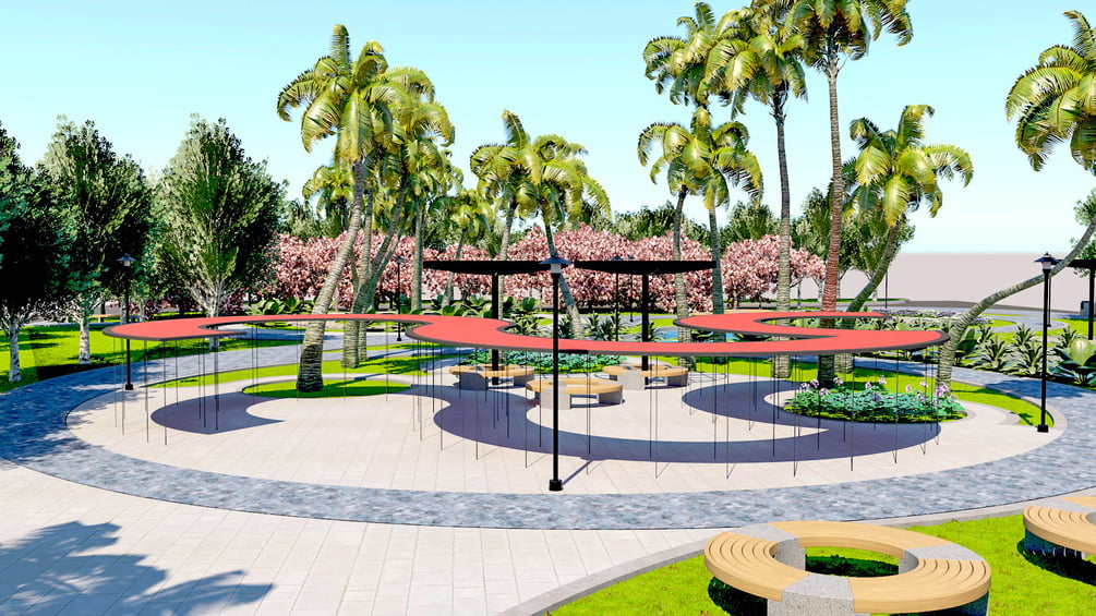 1. Curved Pergolas: Distinctive red, serpentine overhead structures provide architectural interest and shaded seating areas.
