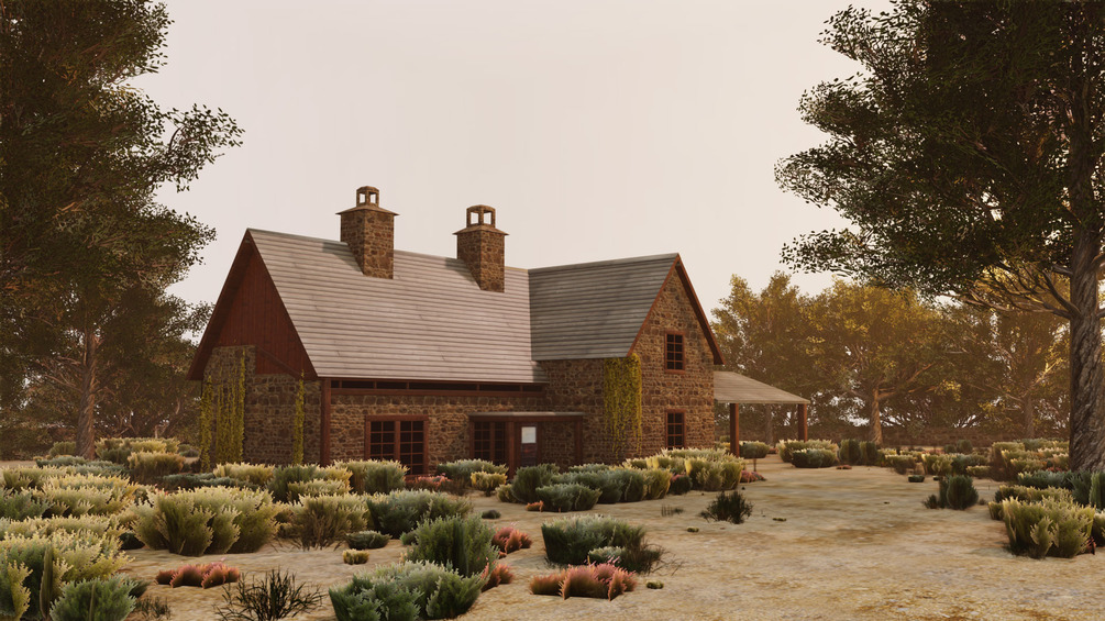* Detailed Architecture: A charming stone house with a gabled roof, chimney, and large windows.