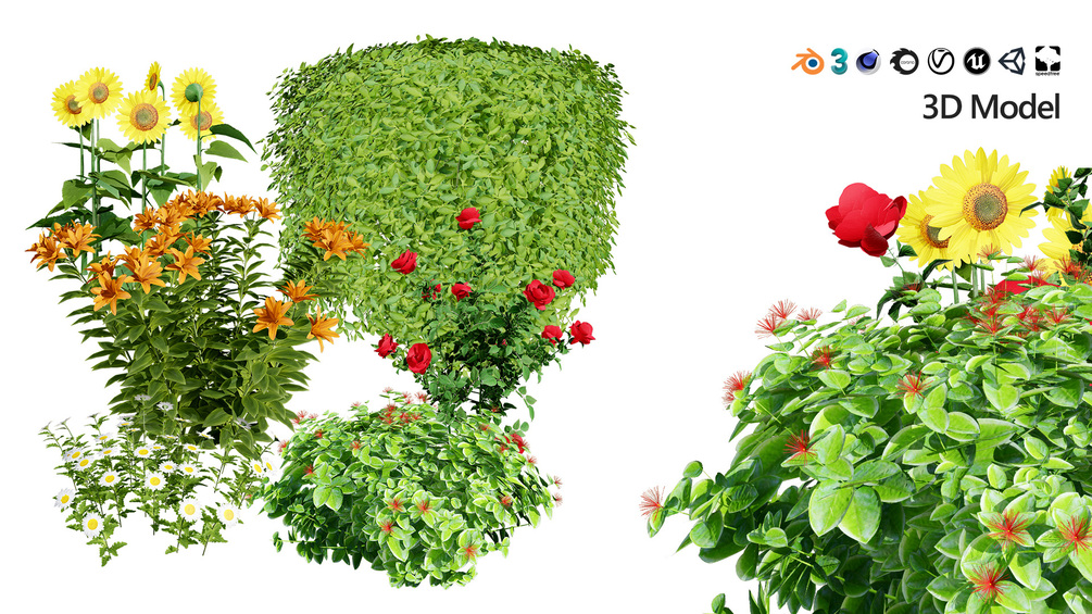 This stunning 3D model collection features a variety of realistic outdoor plants, perfect for enhancing your garden, park, or any outdoor scene. The collection includes: