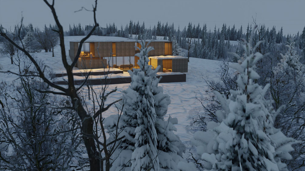 * Modeling: Features clean, precise architectural details and realistic textures, including the signature coarse wood slat cladding and large windows.