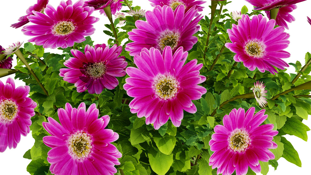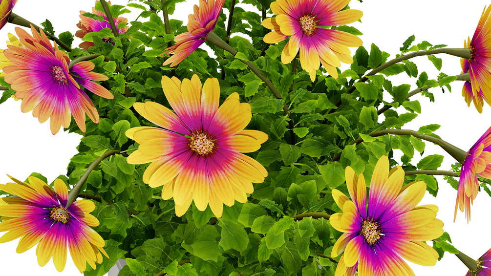 This high-quality 3D model showcases the vibrant beauty of South African Osteospermum flowers, also known as Cape marguerites. The model accurately captures the distinctive features of these flowers, including their daisy-like petals, diverse color variations, and lush green foliage.