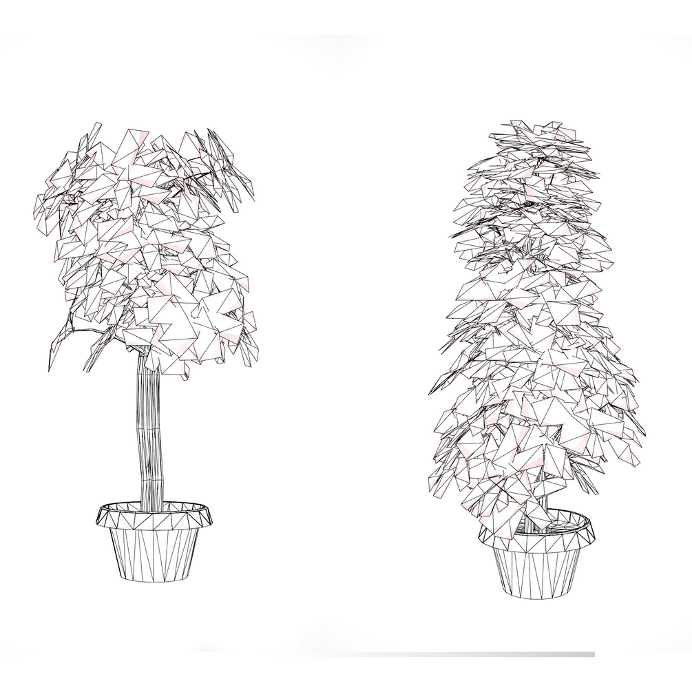 This 3D model product features two low poly potted Schefflera plants on a white background. The plants are modeled with texturing and detail that makes them appear realistic.