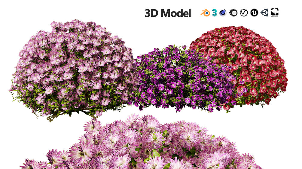 Introducing our exquisite Harrington’s Aster Flower Shrubs 3D model, a perfect blend of artistry and realism to elevate your landscape designs. This masterpiece showcases three distinct, lush shrubs blooming with vibrant flowers in shades of soft lavender, rich purple, and deep red. Each shrub is meticulously crafted to represent the natural beauty and intricate details of the Harrington’s Aster flower.