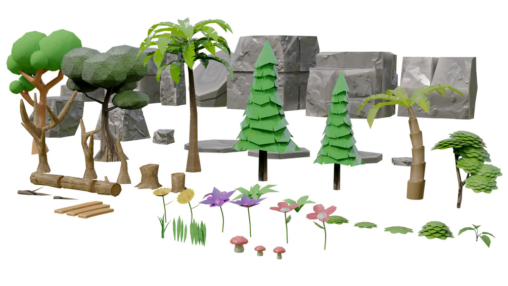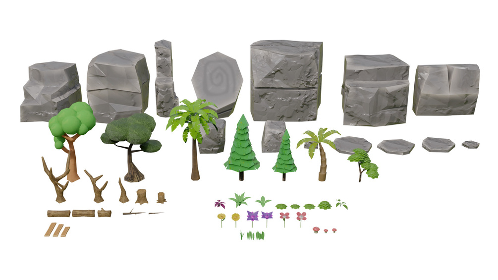 * Rocks: A variety of shapes, sizes, and textures to create rugged landscapes.