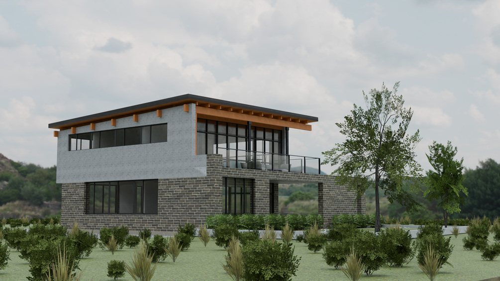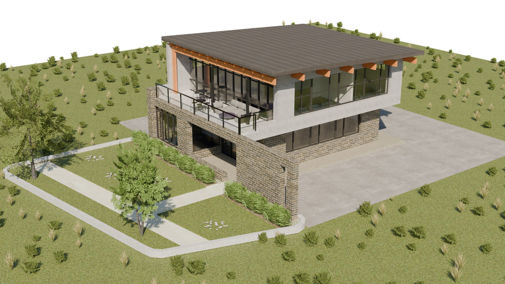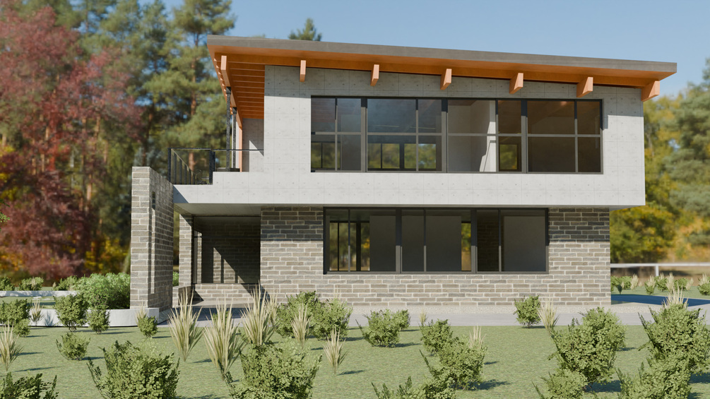 This is a meticulously crafted 3D model of a striking modern two-story building, suitable for use as either a contemporary residence or a small office. The design features a blend of natural and industrial materials, giving it a sophisticated and stylish aesthetic.