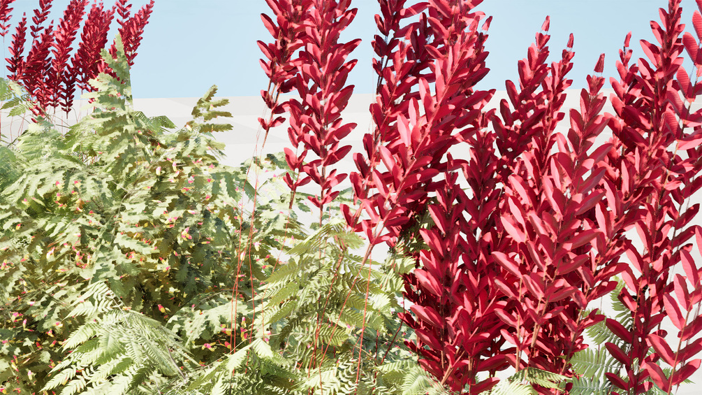 This meticulously crafted 3D model captures the distinctive architectural foliage of both species. The Melianthus major is presented as a lush, multi-stemmed shrub with its characteristic large, pinnate, grey-green leaves, hinting at its tropical yet arid-adapted nature. The Melianthus minor, depicted with vibrant red-orange flower spikes emerging from its similarly structured foliage, showcases its striking floral display.