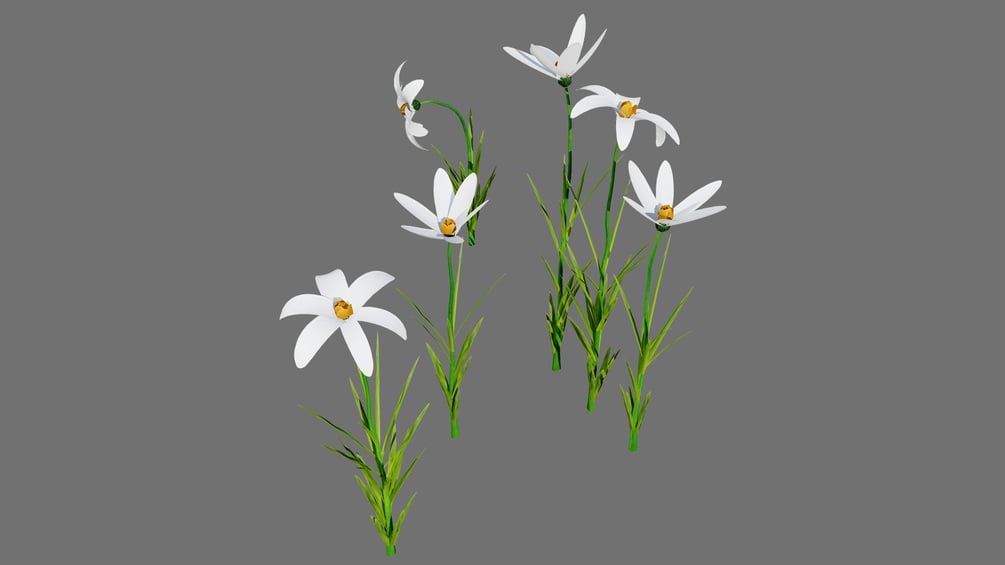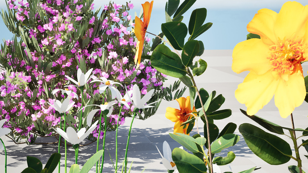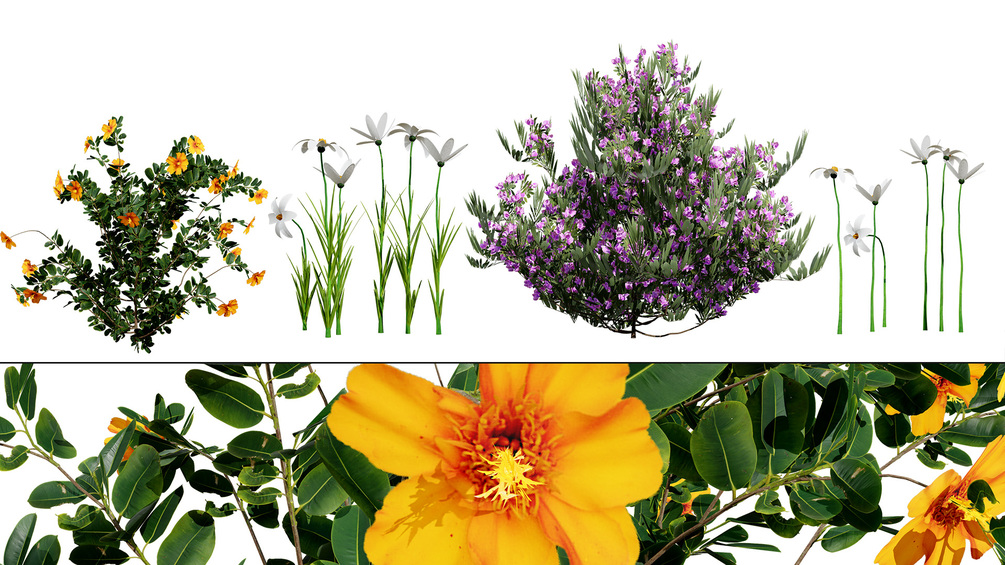 This diverse 3D collection showcases a segment of Moroccan flora, featuring a prominent, dense Oleander Shrub (Nerium oleander) with vivid purple-pink blossoms, known for its resilience and striking color in arid landscapes. Complementing this is a bushy, dark-green-leaved shrub adorned with large, bright yellow-orange flowers, providing a rich, sun-drenched accent. Taller, slender white wildflowers or grasses complete the set, offering delicate vertical elements and subtle ground cover for adding a natural, uncultivated feel to any digital desert, coastal, or Mediterranean environment.