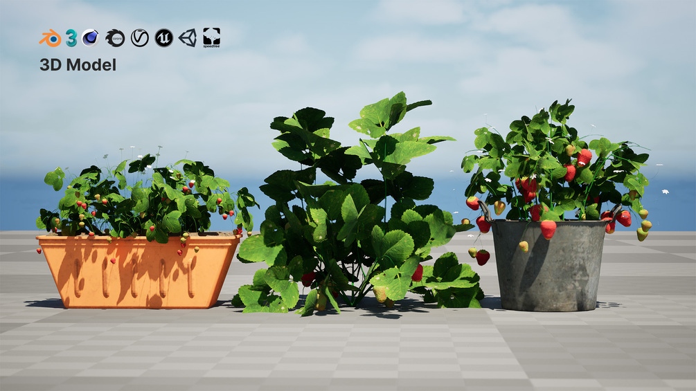 This is a collection of 3D models of strawberry plants, perfect for adding realistic detail to your architectural visualizations, game environments, or other 3D projects. The collection includes variations in plant size, growth stage, and container, offering flexibility for diverse scenes.