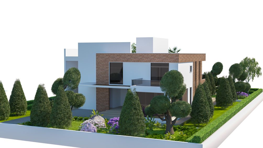 • Contemporary Architecture: A multi-level modern villa design featuring clean white volumes, contrasting brick/wood accents, large windows, and balcony areas.