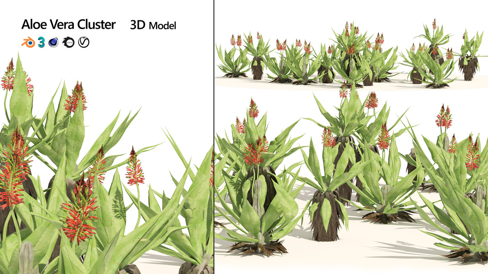 Highly detailed 3d model of Aloe Vera cluster, model contains 2 kind tall and wide aloe Vera plants