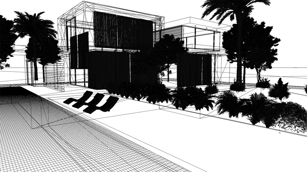 This high-quality 3D model showcases a stunning modern villa nestled amidst lush greenery and swaying palm trees. The exterior boasts a sleek and contemporary design, featuring clean lines, large windows, and a harmonious blend of white walls and natural wood accents. The expansive pool, surrounded by a sun-kissed deck and comfortable loungers, invites relaxation and outdoor entertainment. This versatile 3D model is perfect for architectural visualizations, real estate marketing, interior design projects, and more.