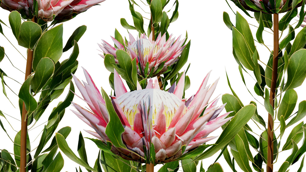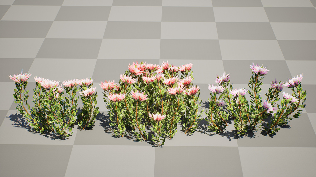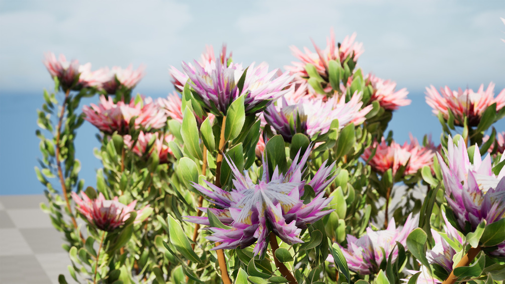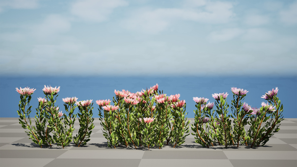 This 3D model showcases South African King Protea bushes, along with Leucadendron. It would be suitable for various 3D asset marketplaces, providing detailed and realistic representations of these beautiful flowering plants.