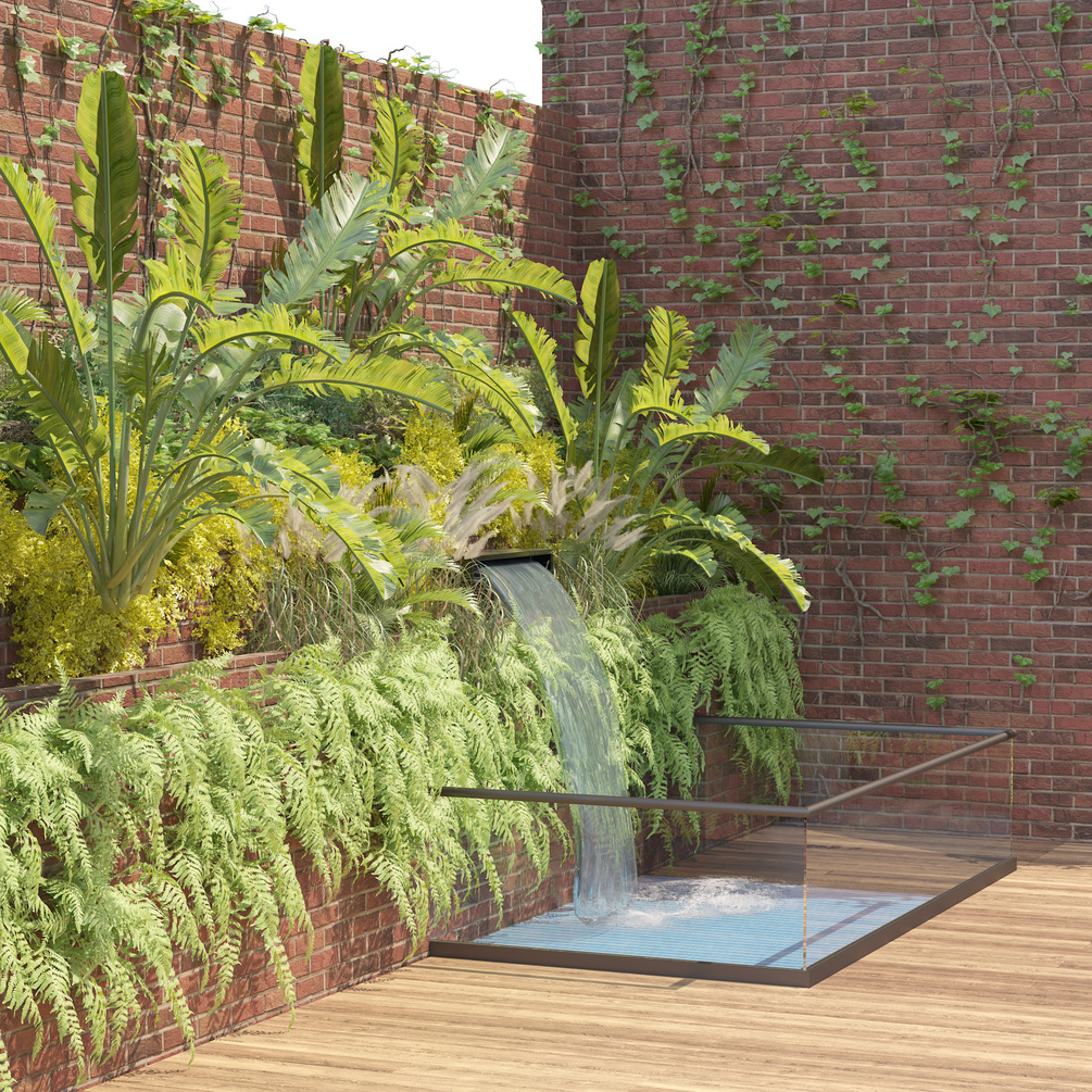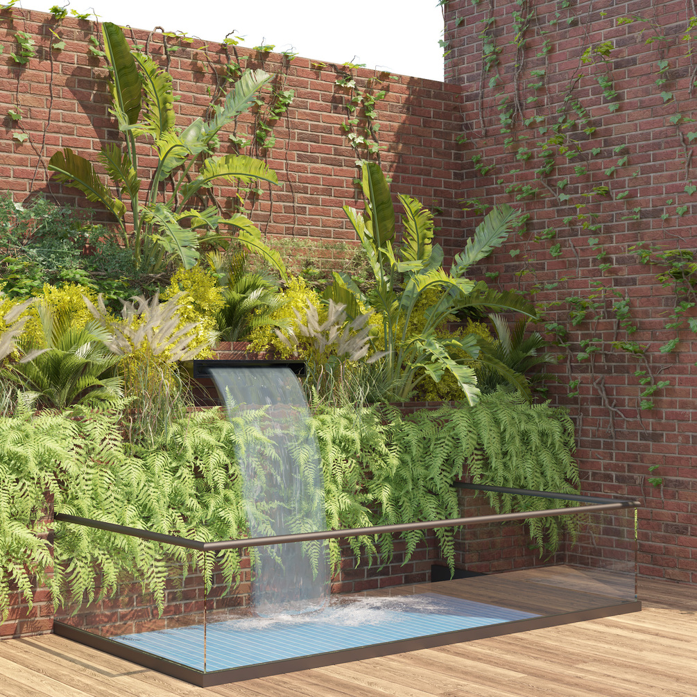 and brick wall, waterfall pool and wood deck.