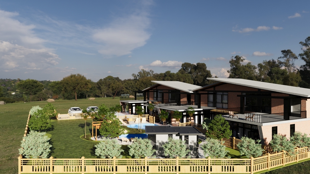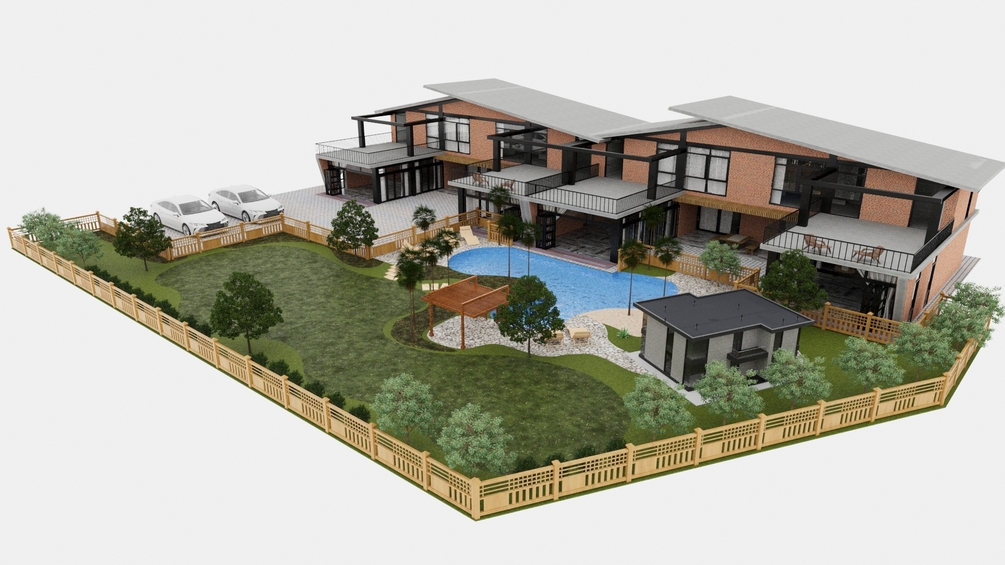 Elevate your architectural visualizations with this captivating 3D scene featuring a contemporary twin villa development with a sparkling pool and inviting patio.