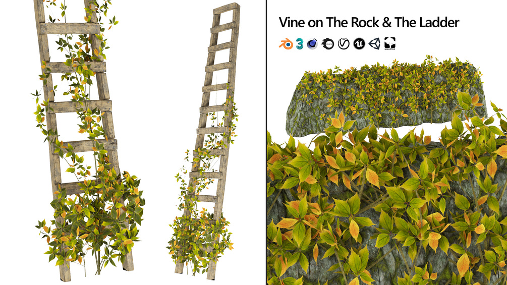 This high-quality, photorealistic 3D model of a climber plant vine on a rock and a rustic ladder is perfect for adding a touch of nature and rustic charm to your scene. The vine is made up of multiple individual strands that are carefully intertwined to create a natural and realistic appearance. The rock and ladder are also highly detailed, with realistic textures and weathering.
