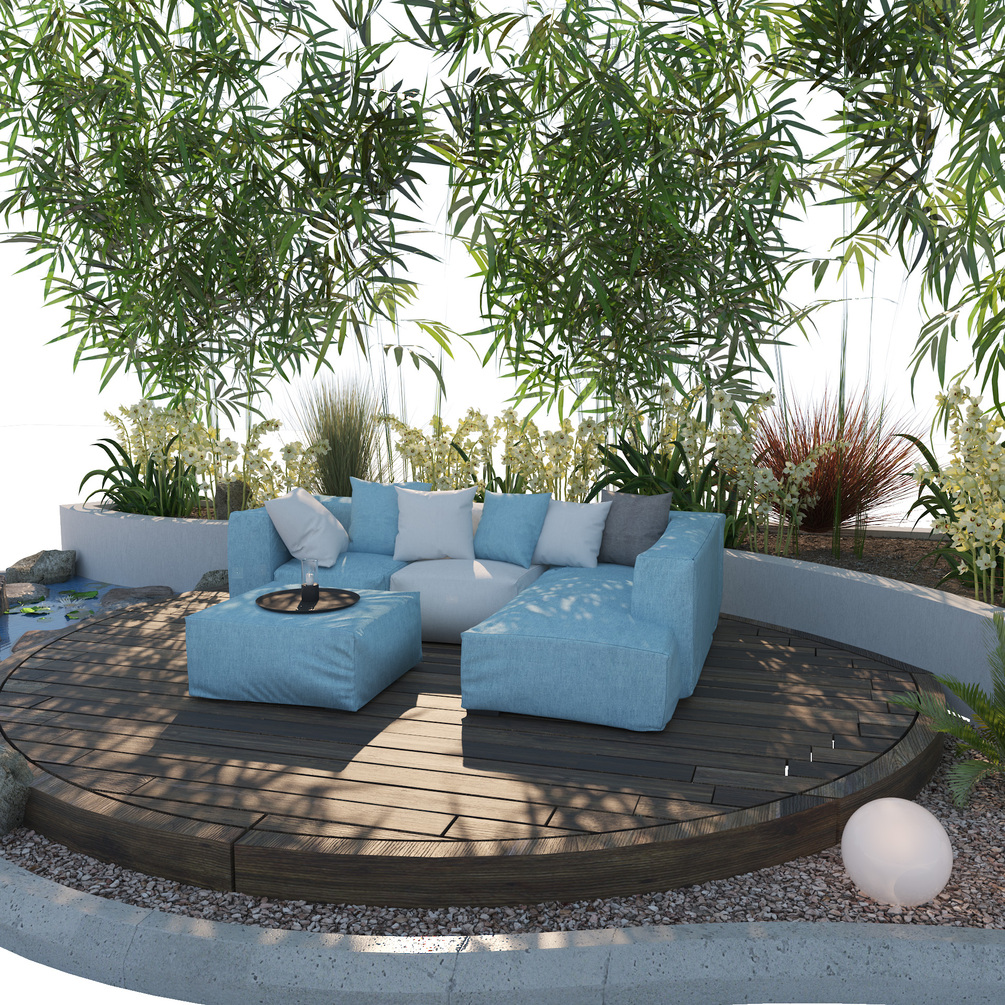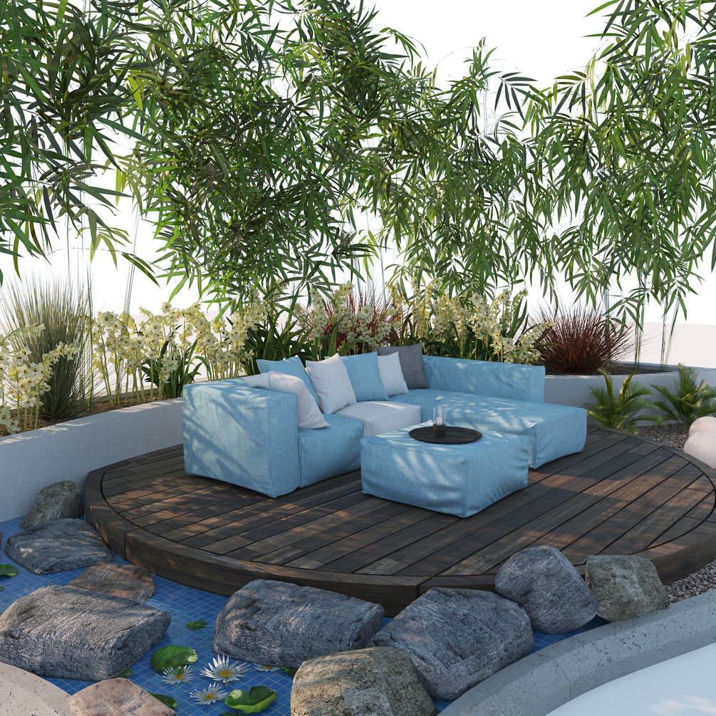 Highly realistic and detailed 3D models of garden patio seating with pool for architectural visualization.